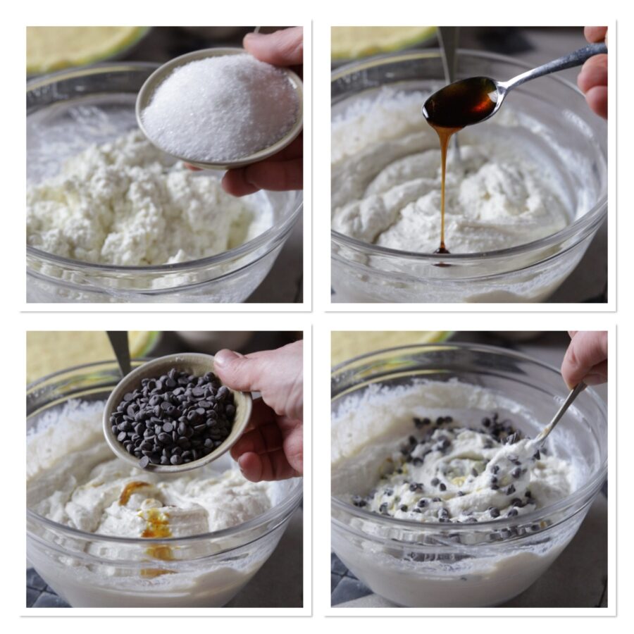 Mash the ricotta with a fork or, if you prefer a silky consistency, pass it through a sieve several times. Combine the sugar, vanilla essence, cinnamon and chocolate chips (according to tradition, candied fruit in small cubes would go, but cassata would be cloying for contemporary tastes, so the dark chocolate variant was born).